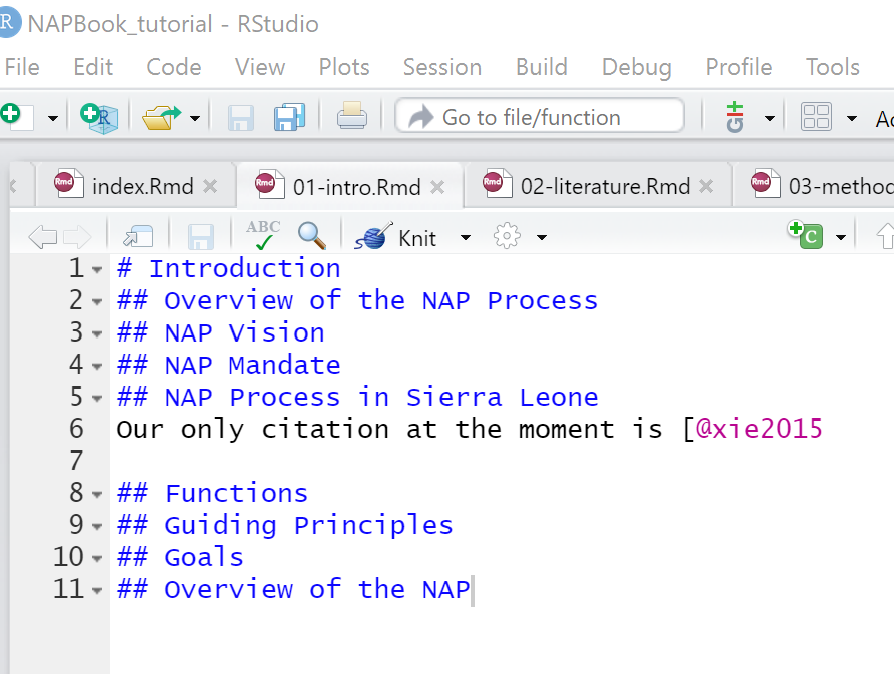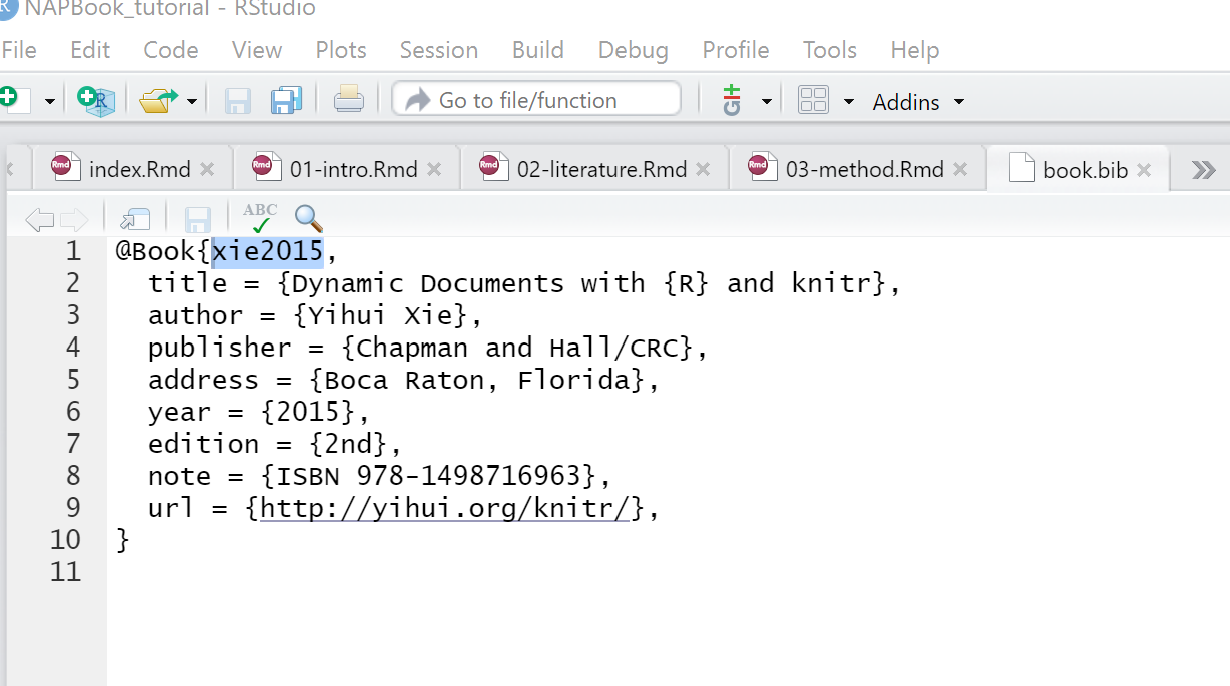 - Back to our project, from the Files tab in bottom right window, open the file named ‘book.bib.’ This is the text file holding our citations.Currently, only one. You will notice that the document type is a book, and the the book name is ‘xie2015.’