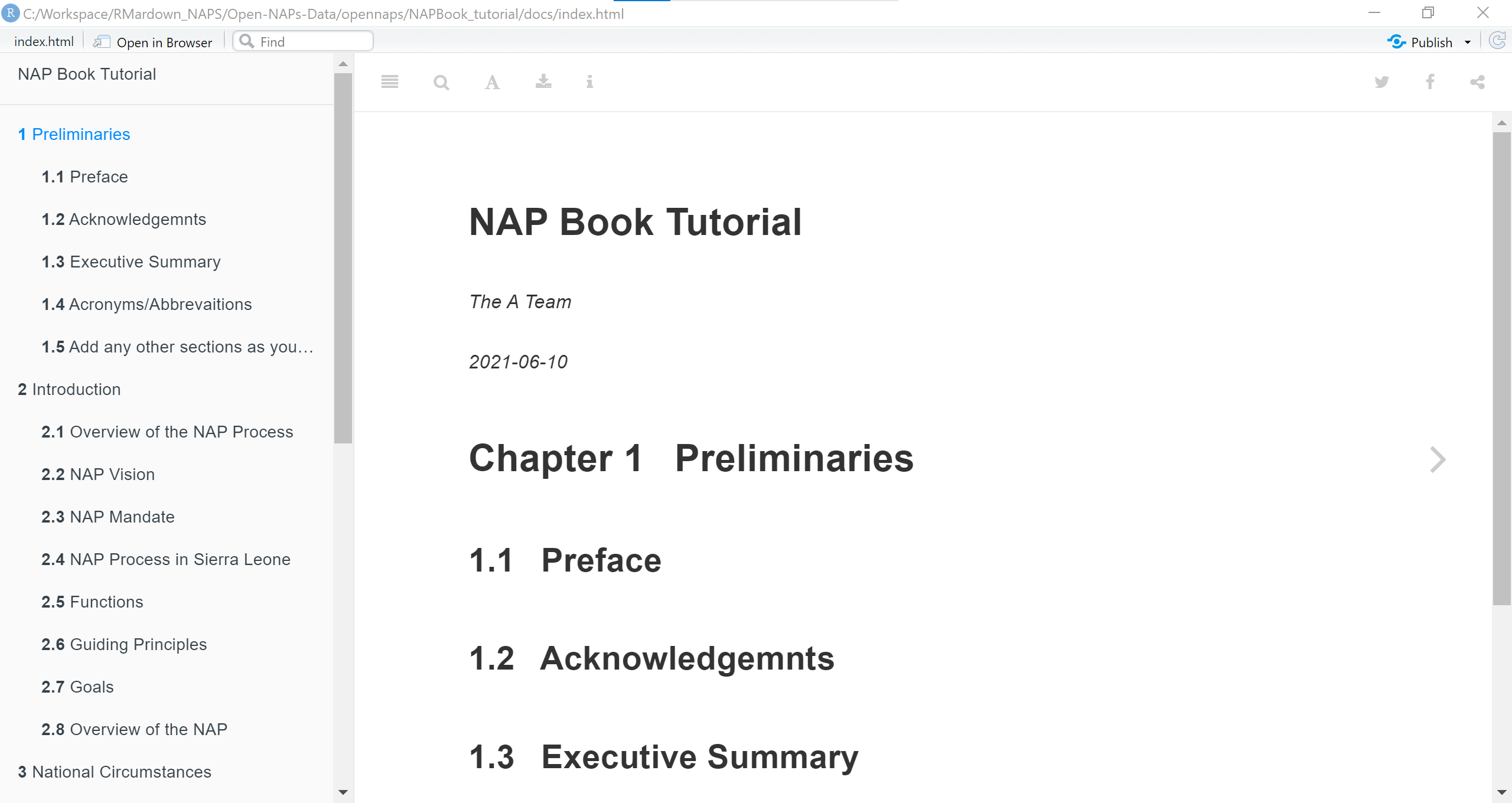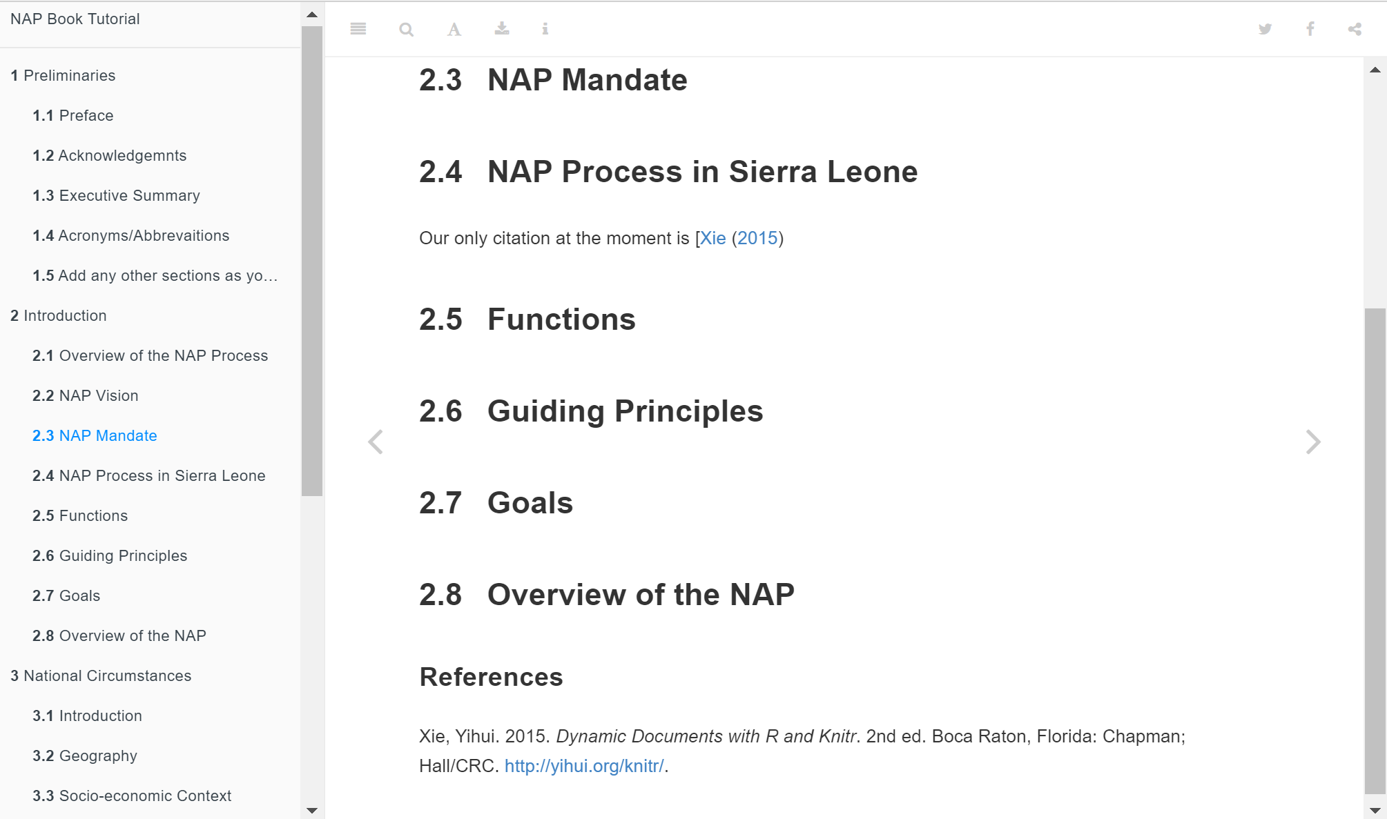 We will use the package bookdown to generate NAP document in a book format. Journal articles or reports can be produced in the same way.